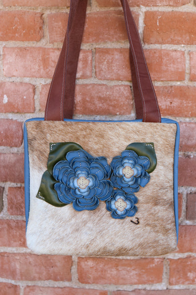 Cowhide Travel Case with Leather Sides and Leather Flowers and Leaves.
