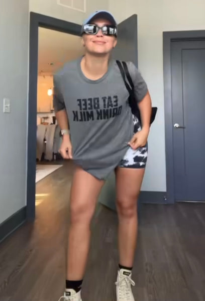 Grey Unisex fit shirt with 'Eat Beef Drink Milk' in Black lettering. During these times it is more important than ever to Thank a Rancher and to Thank a Farmer, for they truly keep this world turning. Show your support by wearing this comfy tee and wear it with pride. Rail Three Ranch has several generations of ranching heritage standing behind them and continue to keep it standing here in Arizona.