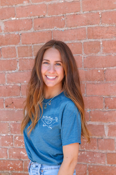 Steel Blue Unisex fit shirt with 'Running Quail' and Rail Three Ranch in Cream.